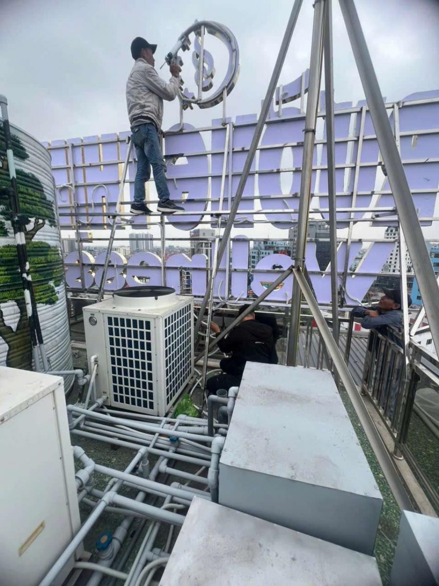 Việc lắp đặt biển hiệu công ty trên cao đòi hỏi kỹ thuật gia cố khung xương và quy trình an toàn lao động nghiêm ngặt.