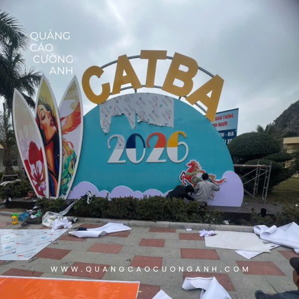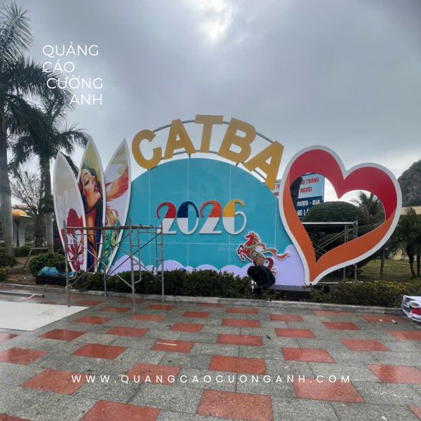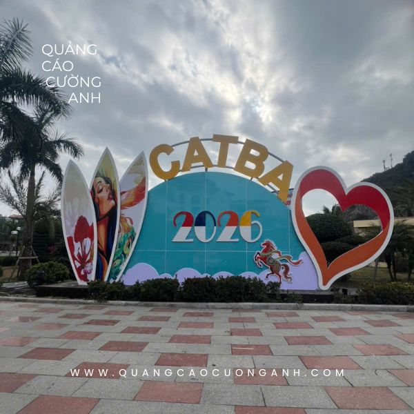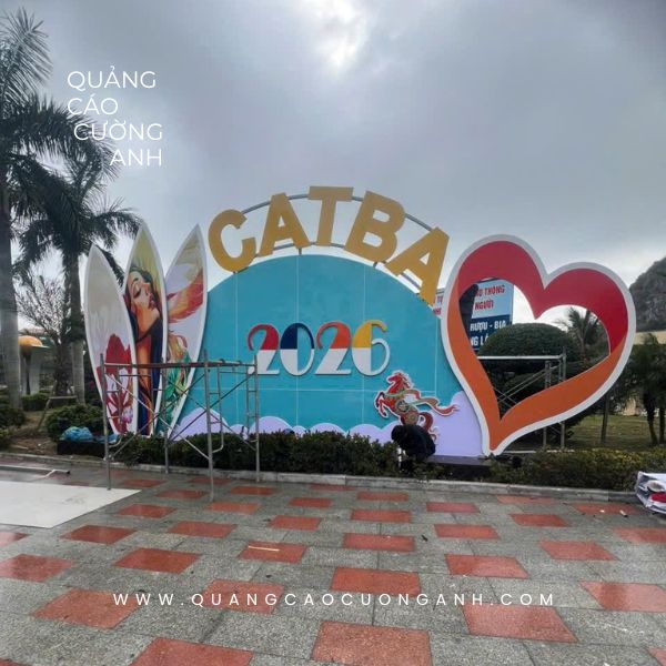 Phần nội dung hiển thị là sự kết hợp tinh tế giữa tấm Alumex 3mm bền bỉ và các chi tiết chữ "CATBA", số "2026" hay hình trái tim được cắt từ Fomex dày 1.8cm bằng công nghệ CNC. Việc sử dụng độ dày 1.8cm cho các chi tiết dán nổi giúp tạo hiệu ứng 3D khối dày dặn, bắt mắt dưới mọi góc nhìn. Đặc biệt, phần bệ đỡ được chúng tôi ốp gỗ Victory sang trọng, tạo cảm giác thân thiện và chắc chắn khi du khách trực tiếp đứng lên tương tác chụp hình.