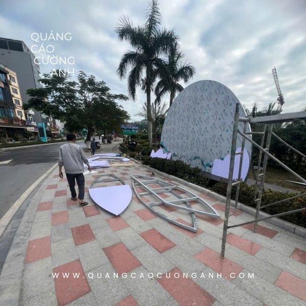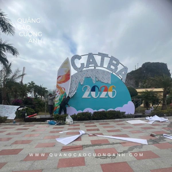 Dưới cái nắng gió của Cát Bà, đội ngũ kỹ thuật của Quảng Cáo Cường Anh đã khẩn trương lắp ghép các lớp layer. Từ việc cố định khung nền hình bán nguyệt đến việc dán nổi các tấm Alu in hình nghệ thuật, tất cả đều được thực hiện chuẩn xác để tạo ra một tổng thể hài hòa nhất.